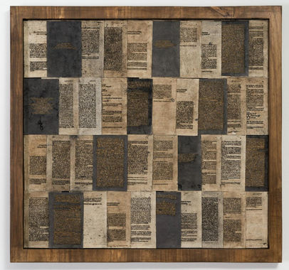 Embroidery with metallic thread on altered book pages and wood